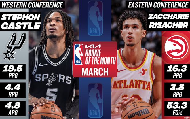 马刺后卫卡斯尔当选3月份西部最佳新秀,老鹰前锋里萨谢当选3月份东部最佳新秀。