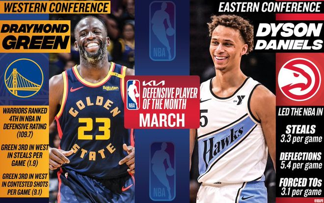 勇士前锋格林当选3月份西部最佳防守球员,丹尼尔斯当选3月份东部最佳防守球员。